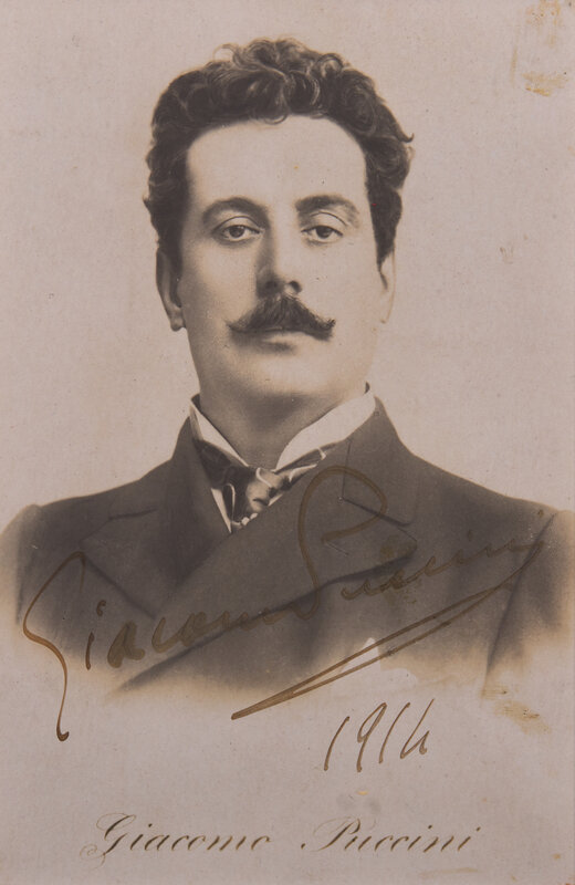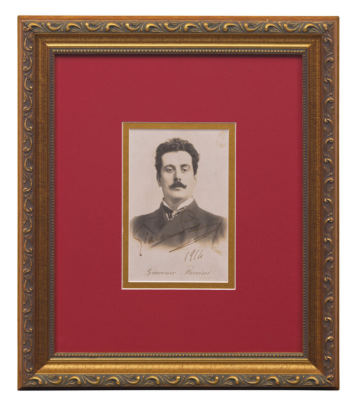 No place, 1914. Photographic portrait of Puccini, signed and dated by him ("Giacomo Puccini 1914"). Approximately 5 1/2 x 3 1/2 in. (140 x 89 mm) (sight). In mat and unexamined out of frame, 13 x 11 1/4 in. (330 x 286 mm).