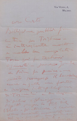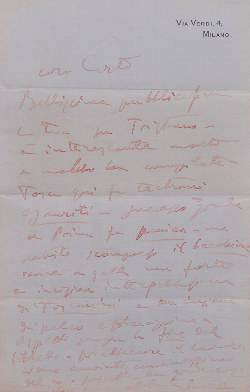 Italian composer Giacomo Puccini writes to his close friend Carlo Clausetti (1869-1943), who co-managed the Naples branch of Casa Ricordi, a family-run firm of music publishers established in 1808. The company was very successful through its distribution of work by Italian and international composers, and managed the reproduction rights for Puccini himself. Notably, Puccini here makes reference to his famous opera Tosca, that had premiered in January 1900.