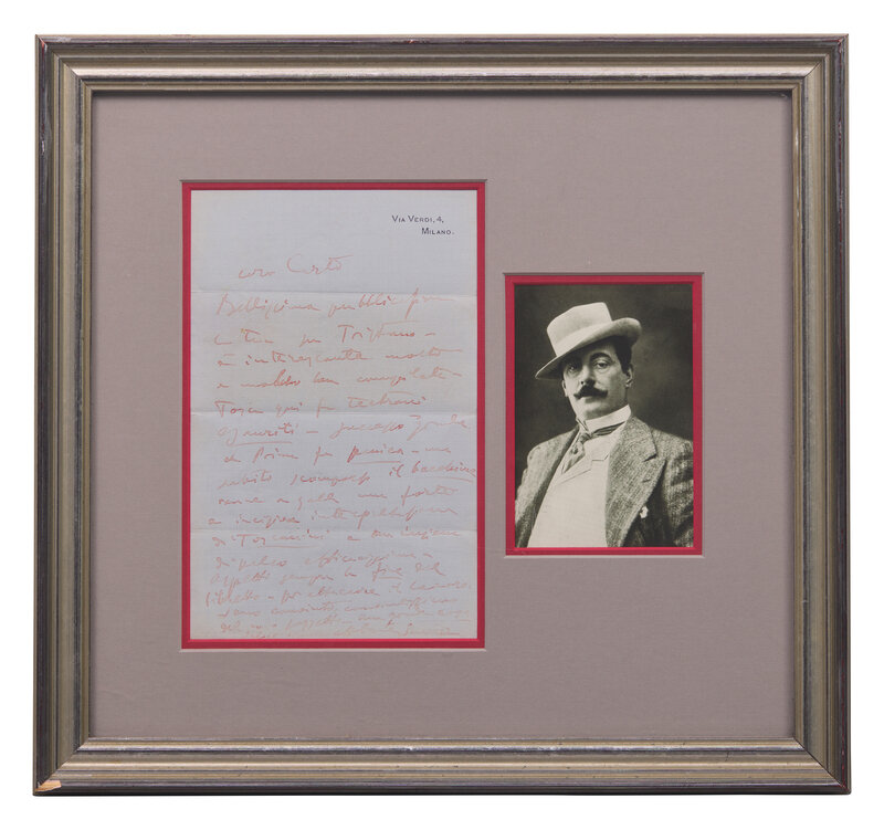 Milan, January 5, 1908. Single sheet, approximately 9 1/2 x 6 1/4 in. (241 x 159 mm) (sight). Autograph letter in Italian, signed by Giacomo Puccini in red ink to his friend Carlo Clausetti (in translation): "You have written an excellent work on Tristan; it is most interesting, and very well put together. Tosca here has full houses and is a great success. At the first performance there was panic but as soon as the chaff had disappeared, a strong and incisive interpretation by Toscanini came to the surface, with a competent stage production. I am still waiting for the end of the libretto so I can attack the work. I am convinced, quite convinced that the subject is right--something really good." Creasing from old folds. In mat with a portrait of Puccini, and unexamined out of double-pane plexiglass frame, 16 x 17 1/4 in. (406 x 438 mm).