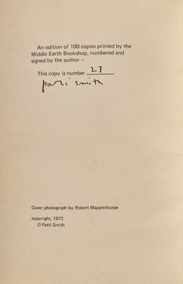(Philadelphia: Middle Earth Books, 1972). First and limited edition, #27/100 copies signed and numbered by Smith. 8vo. Unpaginated. No. 3 in Series 1 of the Middle Earth Pamphlet series. Original stiff printed wrappers, front cover with white silhouette of Smith based on the photograph of her by her close friend, Robert Mapplethorpe, soiling to front wrapper, wear along extremities and spine.