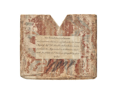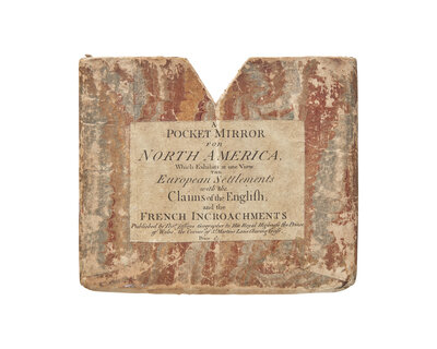 (London): Tho(ma)s. Jefferys, (May, 1755). First state. Engraved map with hand-colored outlining. With rare original marbled paper-covered slip case, sides with original printed labels ("A Pocket Mirror for North America, Which Exhibits at one View the European Settlements with the Claims of the English; and the French Incroachments"). Map dissected into 16 sections and laid down onto original linen; light offsetting and toning; rubbing and wear to slip case. 18 1/2 x 20 1/2 in. (470 x 521 mm). Stevens & Tree 51a (no mention of case); Phillips, Maps of America p. 576 (no mention of case); Sabin 63513