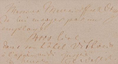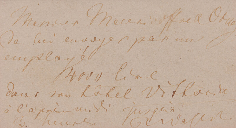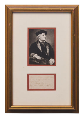 Sorrento: Hotel Vittoria, no date (possibly 1876). Single oblong card, approximately 2 x 4 in. (51 x 102 mm) (sight). Autograph note in French, signed by Richard Wagner ("R. Wagner") on his printed calling card, to Messrs. Meierhoffer & Orney, requesting them to "send him by an employee 4000 lire to his hotel Vittoria in the afternoon until 3 o'clock..." In mat with a portrait of Wagner, and unexamined out of double-pane glass frame, 15 1/4 x 10 1/2 in. (387 x 267 mm).