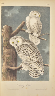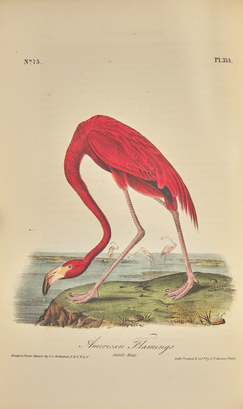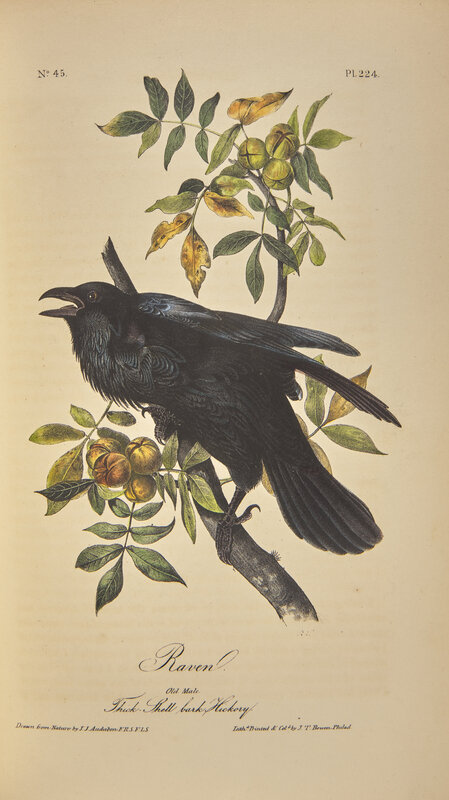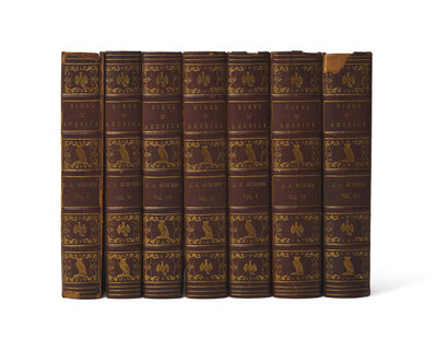 New York: Published by J.J. Audubon/Philadelphia: J.B. Chevalier, (1839-)1840-44. In seven volumes. First octavo edition. With half-title in each volume, as well as subscriber's list. Illustrated with 500 hand-colored lithographed plates (each with tissue guard), after Audubon by W.E. Hitchcock, R. Trembly and others, printed and colored by J.T. Bowen, as well as numerous in-text wood engravings. Three-quarter brown morocco over marbled paper-covered boards, stamped in gilt, gilt bird motif ornaments along spines, boards and joints rubbed, spines slightly faded, scattered chipping and wear to spine ends and extremities; all edges gilt; matching marbled endpapers; by Waters, Baltimore; front hinge of first volume cracked; scattered, generally light spotting to text and plates, somewhat heavier in first, second, fourth, and seventh volumes. Ayer/Zimmer, p. 22; Bennett, p. 5; McGill/Wood, p. 208; Nissen IVB 51; Reese, Stamped With a National Character 34; Sabin 2364