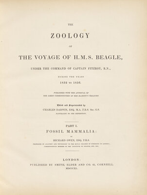 The important zoological reports obtained from the voyage of the H.M.S. Beagle, edited and superintended by Charles Darwin. Originally appearing in 19 numbers, published between February 1838 and October 1843, Darwin, as well as editing the work, contributed a preface to the whole, as well as a geological introduction to the Fossil Mammalia, and a geographical introduction to the Mammalia.