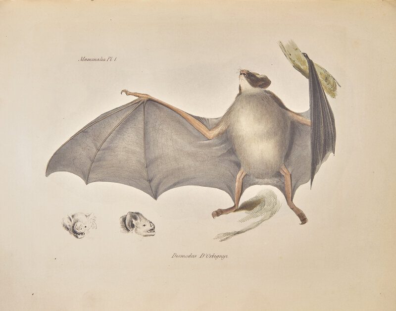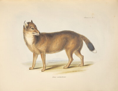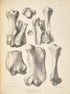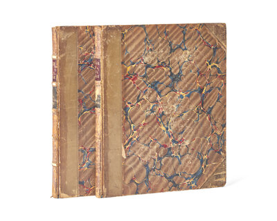 London: Published by Smith, Elder and Co., (1838)-40. In two volumes. First edition. Parts I and II only (of five), comprising: Fossil Mammalia (Richard Owen, [1838]-1840) and Mammalia (George R. Waterhouse, 1839). 4to. (ii), iv, iv, 111, (1); (iv), ix, (3), 97, (1) pp.; errata at B1 in second volume; half-title in Part II. Illustrated with 32 lithographed plates (including one large folding plate) in Part I, and 32 hand-colored lithographed plates and three steel-engraved plates in Part II. Contemporary three-quarter tan calf over marbled paper-covered boards, red and green morocco spine labels, stamped in blind and in gilt, extremities and boards scuffed and worn, front board of each volume detached, spines dry and chipped, lower label of second volume largely perished; speckled red edges; light spotting and toning to text leaves; wear along edges of large folding plate, two closed tears in gutter of same with partial tape repairs; foxing to plates II-IV in first volume; scattered light to moderate foxing to remaining plates in first volume and scattered throughout second volume. Freeman 9.1 and 9.2; Sabin 18649