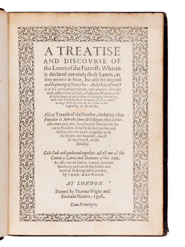 First edition of the earliest treatise on English forest laws. A Treatise and Discourse of the Lawes of the Forrest comprises the revised and expanded edition of a pamphlet written and privately circulated by gamekeeper of Waltham Forest and Justice in Eyre of the New Forest, John Manwood, in 1592. For over 350 years following its initial publication, his work was considered to be the standard text on forest law.