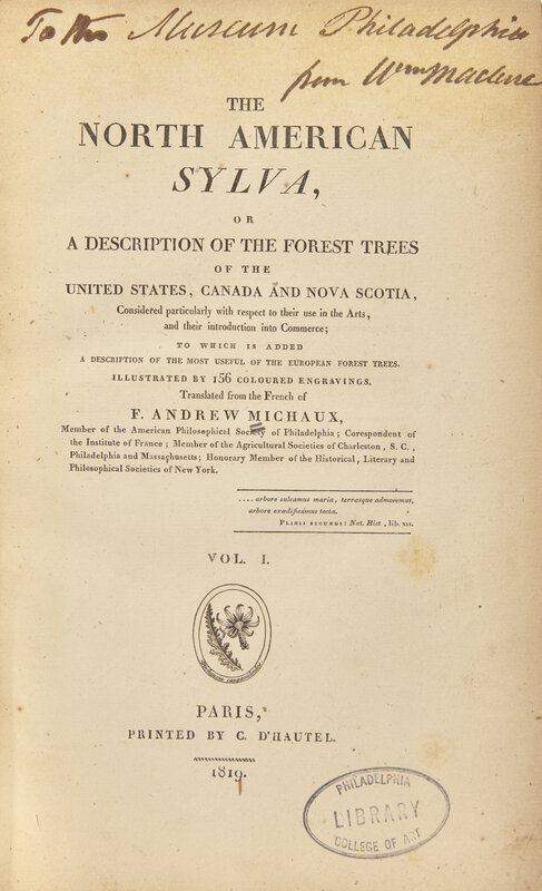 A superb association copy of this famed work on North American trees, inscribed by Scottish geologist, educational reformer, and philanthropist, William Maclure (1763-1840), printer and publisher of the first American edition in 1841-42. First published in France between 1810-13 as Histoire des Arbres Forestiers de l’Amerique Septentrionale, this first edition in English was published between 1817-19--"Of the various editions with the text in English this, notwithstanding some typographical errors, is the best." (Sabin)