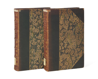 Paris: Printed by C. d'Hautel, 1819. In two volumes. First edition in English. Tall 8vo. (vi), v, (i), 383; (iv), 417, (1) pp., including half-titles. Presentation copy, inscribed by Scottish naturalist William Maclure on title-page of each volume: "To the Museum Philadelphia from Wm. Maclure". Illustrated with 156 stipple-engraved color plates after Pancrace Bessa, Pierre-Joseph Redouté, Henri-Joseph Redouté, and others. Three-quarter green morocco over marbled paper-covered boards, spines browned, library labels at foot of each spine, residue in upper spine and boards from removed labels, light wear along extremities, light rubbing to boards; all edges untrimmed; gift label on front paste-down of each volume; library ink stamp at bottom of each title-page, library pencil notations on verso of same and in gutter of facing page; library ink stamp at top of rear paste-downs; scattered foxing to text; light to moderate spotting and soiling to plates; plates free of library stamps; dampstaining in fore-edge of leaves at front of Vol. II. Sabin 48694 (three-volume issue, see note); Nissen BBI 1361; see Reese, Stamped With a National Character 21