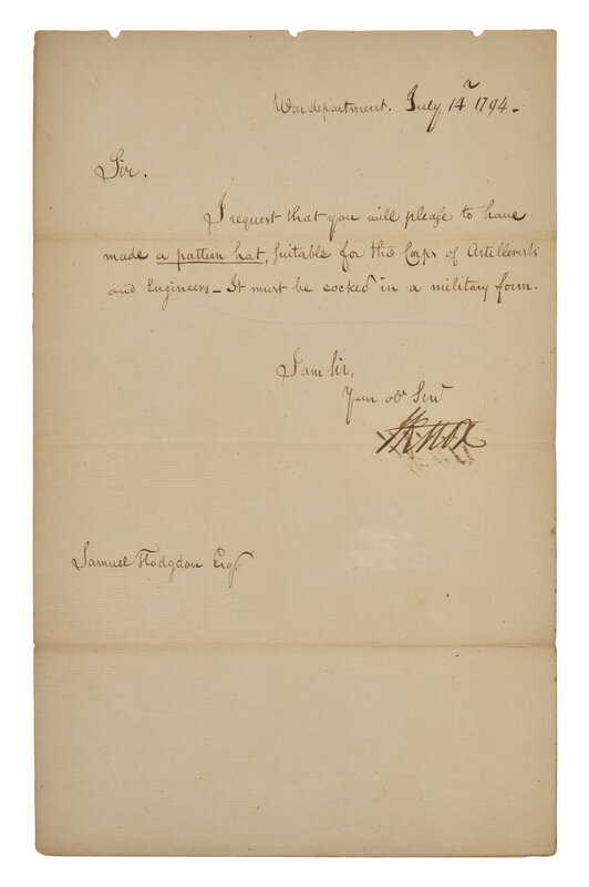 (Philadelphia): War Department, July 14, 1794. Single sheet, 12 1/2 x 8 in. (317 x 203 mm). Manuscript letter in a secretarial hand, signed by Secretary of War Henry Knox ("H Knox"), requesting superintendent of military stores Samuel Hodgdon "to have made a pattern hat, suitable for the Corps of Artillerists and Engineers--It must be cocked in a military form." Creasing from when folded; light edgewear; light abrasion in lower right side, but not affecting text; light ink offsetting in Knox's signature from when originally folded.
