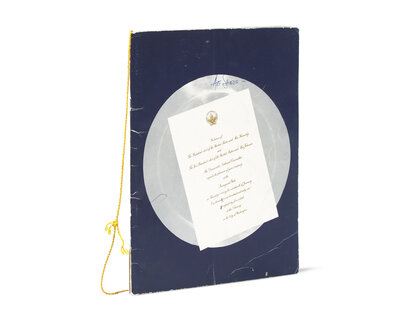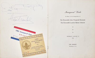 Washington, D.C.: The Armory, January 19, 1961. Printed program for the "Inaugural Gala In Honor of the Inauguration of The Honorable John Fitzgerald Kennedy The Honorable Lyndon Baines Johnson...", signed by most of the evenings performers. 4to. Unpaginated (20 leaves). Illustrated with black and white portraits, including the Kennedys and Johnsons, as well as the night's performers, and signed (in order) by Helen Traubel, Harry Belafonte, Milton Berle, Leonard Bernstein, Joey Bishop, Nat King Cole, Tony Curtis, Bette Davis, Jimmy Durante, Ella Fitzgerald, Mahalia Jackson, Alan King, Janey Leigh, Frederic March, Ethel Merman, Sir Laurence Olivier, Sidney Poitier, Keely Smith (inscribed to Art Sands, the autographs collector) and Louis Prima, Juliet Prowse, Anthony Quinn, and Frank Sinatra. Stapled on inner front wrapper are Sand's printed Inaugural Ball and Gala tickets. Original printed wrappers, gold spine cord and tassel, signed on front wrapper by Sands, scattered creasing and light wear, split along foot of spine, tassel detached but present.