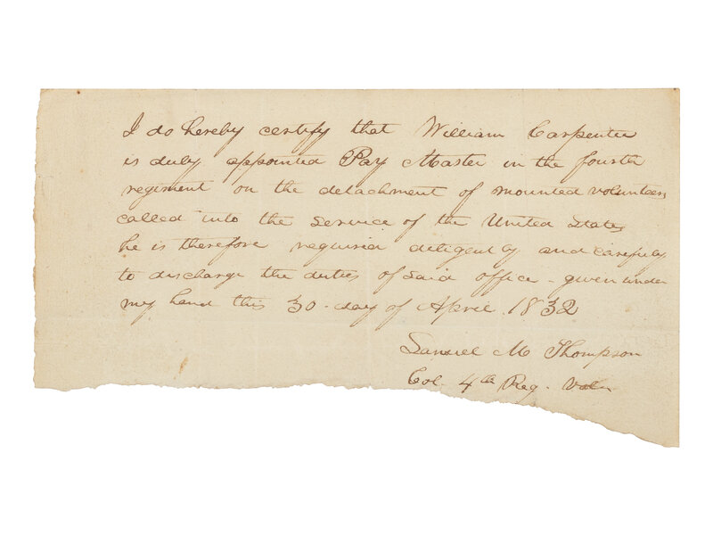 "I do hereby certify that William Carpenter is duly appointed Pay Master in the fourth regiment on the detachment of mounted volunteers called into the service of the United States he is therefore required diligently and carefully to discharge the duties of said office--given under my hand this 30 day of April 1832 Samuel M. Thompson Col. 4th Reg. Vols."