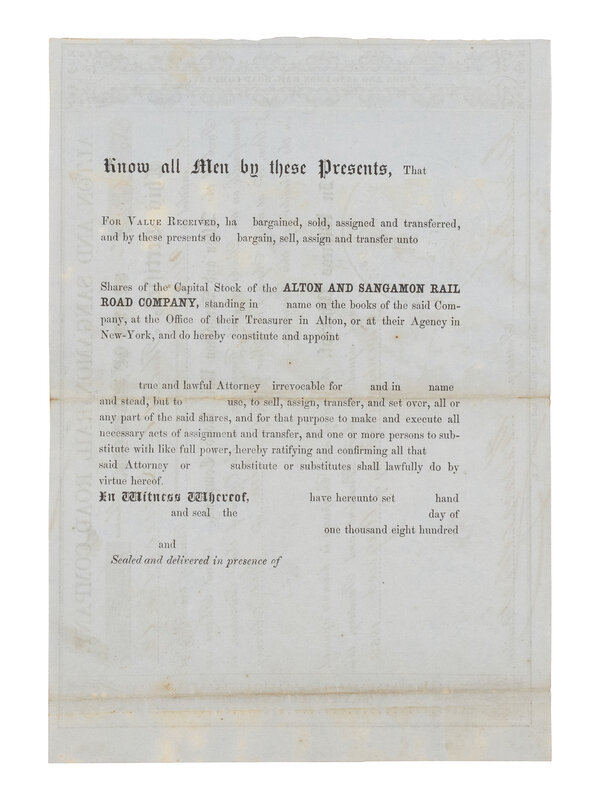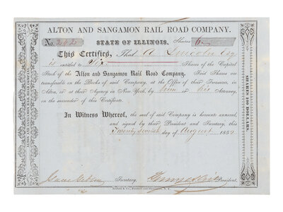 Illinois, August 27, 1852. Partially-printed Alton and Sangamon Rail Road Company stock certificate, issued to Abraham Lincoln ("A Lincoln Esq") for six shares. One oblong sheet; 5 1/2 x 8 in. (140 x 203 mm); accomplished in manuscript; circular blindstamp in bottom left; creasing from old folds; light spotting. Signed by treasurer Isaac Gibson and president Harry A. Coit.