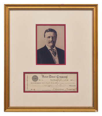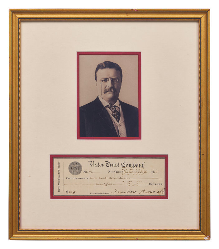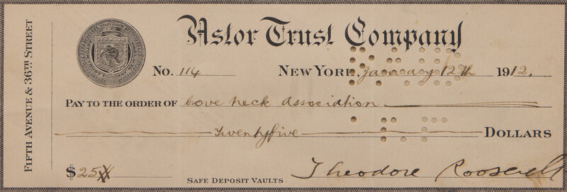 New York, January 12, 1912. Single oblong sheet, approximately 3 x 8 1/4 in. (76 x 209 mm). Partially-printed Astor Trust Company check, signed by Theodore Roosevelt, drawn on his account for $25 and payable to the Cove Neck Association. Banks perforated "Paid" stamp in upper right; Roosevelt's signature slightly smudged. In mat with a portrait of Roosevelt, and unexamined out of frame, 16 3/4 x 14 5/8 in. (425 x 371 mm).