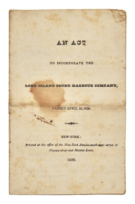 Very rare first edition of this Act incorporating the Long Island Sound Harbour Company. Passed by the New York State legislature on April 16, 1830, the Act lists 25 articles for the establishment of the Company, "constituted for the purpose of constructing a harbour near the shore of Long Island Sound in the town of Southold, in the County of Suffolk; and of making a channel or canal to connect the said harbour with the said sound." (p. 3)