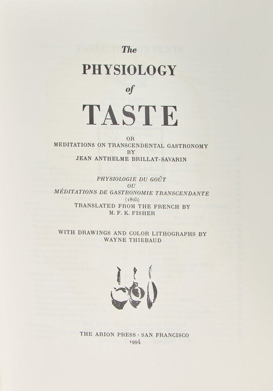 A handsome copy of the most famous work on gastronomy, finely illustrated with lithographic plates by artist Wayne Thiebaud. Continuously in print since it was first published in 1825, The Physiology of Taste is a humorous celebration of everything culinary and and covers a range of topics, both philosophical, historical, and practical--from the philosophy of cooking, the history of chocolate and coffee, to matters of diet and weight.