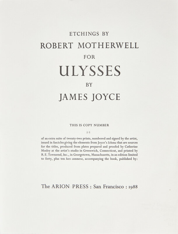 A fine copy of this monumental deluxe edition of Joyce's Ulysses by the Arion Press, with 40 etchings by Robert Motherwell, and an additional suite of 22 prints by him.