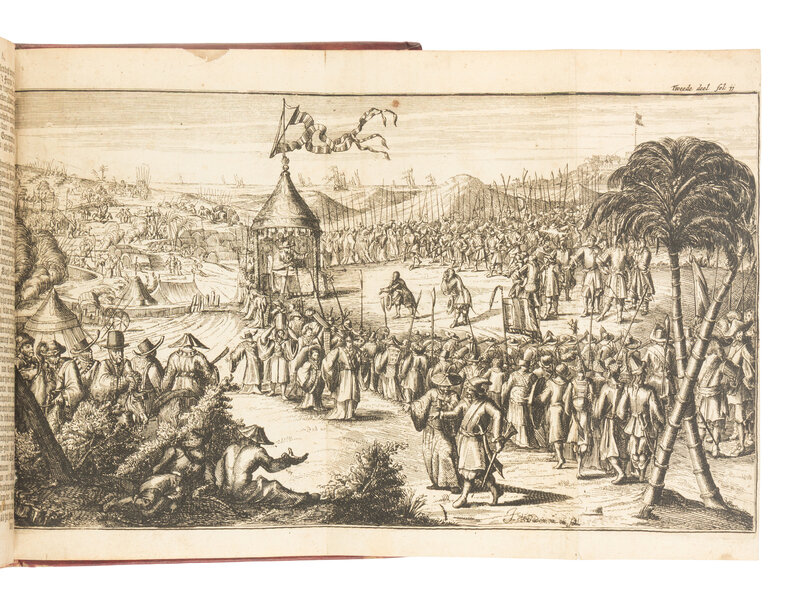 Amsterdam: Jan Claesz ten Hoorn and Michiel Pieters, 1675. Three parts in one volume. First edition. Small 4to. Illustrated with an engraved title-page and seven engraved plates (including one folding), by J. van Avele and J. van Baden. Modern red sheep, recased; additional title-page soiled; browning and spotting throughout; a few small dampstains; lacking one preliminary leaf of text; one plate loose. Cordier Sinica 285
