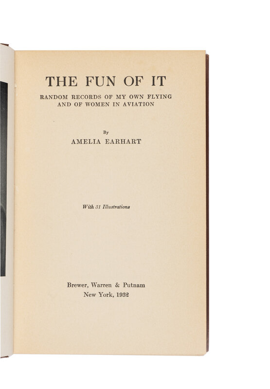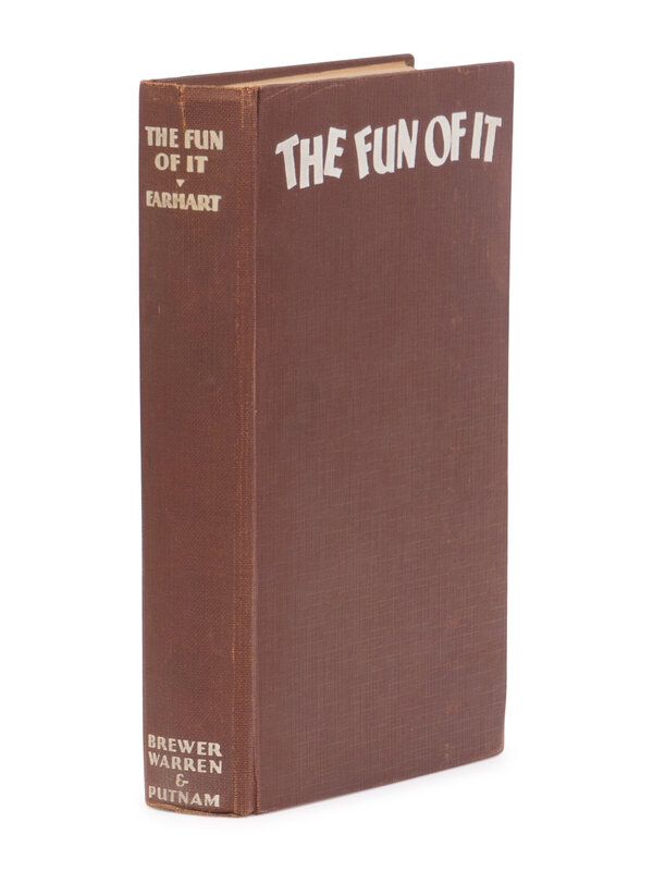 Signed by Earhart, and with original 78 rpm Silvertone phonograph recording of her London address given upon completing her 1932 solo transatlantic flight. The Fun of It profiles the careers of female aviators and recounts significant events of Earhart's own. The title is derived from one of Earhart's best-known quotes, "Flying may not be all plain sailing, but the fun of it is worth the price."