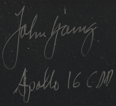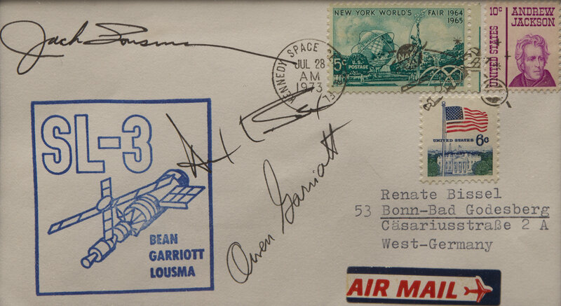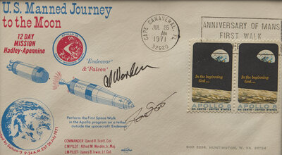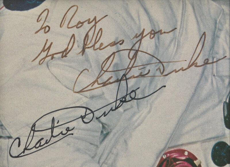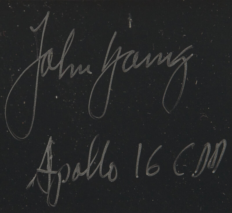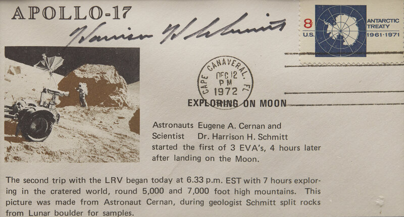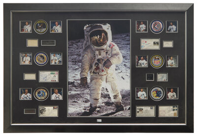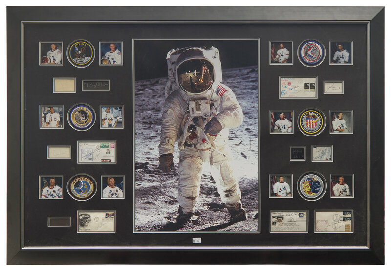 Locations and dates vary. Group of autographs, or signed First Day Covers, by all 12 NASA Astronauts to have walked on the moon, including: Neil Armstrong and Buzz Aldrin (Apollo 11); Charles "Pete" Conrad and Alan Bean (Apollo 12); Alan Shepard, Stuart A. Roosa, and Edgar B. Mitchell (Apollo 14); David Scott (F.D.C. also signed by Alfred Worden), and James B. Irwin (Apollo 15); John W. Young and Charles M. Duke (Apollo 16); Gene Cernan (F.D.C. also signed by Ronald Evans) and Harrison Schmidt (Apollo 17). Each in mat below respective flight suit photographs, and official crew mission patches, in frame, 45 x 66 in. (115 x 167 cm).