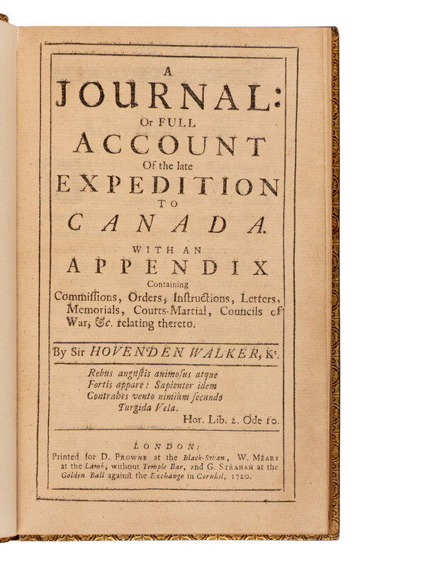 First edition of Walker's account "of his unfortunate 1711 expedition against Canada, which operated from Boston and was of New England's instigation. Having distinguished himself in the West Indies, he was placed in command of the naval forces. Ill fortune attended the enterprise, eight transports being cast away and nearly 900 soldiers drowned...The expedition was a total failure" (Lande). This volume is Walker's effort at self-vindication, based on memory, a pocket diary, and papers from the Admiralty. Most of Walker's original logs and charts from the expedition were lost in an explosion in 1711.