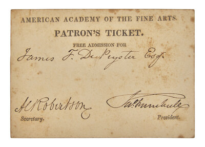 (New York, 1818). Engraved "Patron's Ticket" to the American Academy of the Fine Arts, signed by John Trumbull as President, and Secretary A. Robertson, and issued to James Ferguson De Peyster. Printed on thick card; spotting. 3 1/16 x 4 3/8 in. (78 x 111 mm). Cowdrey, American Academy of Fine Arts and American Art-Union, p. 69