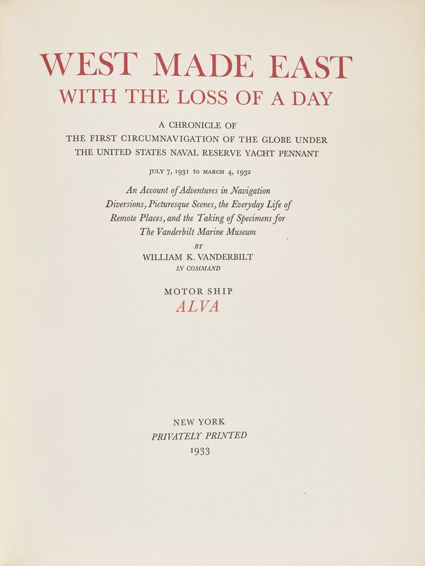 New York: Privately Printed (for William K. Vanderbilt, by Edmund Garrett), 1933. First edition, deluxe issue, #195/200 numbered copies on Rives paper (from a total edition of 1,000). Presentation copy, inscribed by the author, William K. Vanderbilt, to Vincent Astor: "To / Vincent Astor / With the compliments of the author / W.K. Vanderbilt / Dec. 25 1933". Large 4to. (ii), xx, 379, (3) pp. Text printed in red and in black. Illustrated with seven color plates (each with captioned tissue guard) and numerous black and white photographic reproductions and color maps. Publisher's deluxe quarter navy blue levant over blue-green paper-covered boards, lettered in gilt, front board with a gilt, blue, and red motif of Vanderbilt's yacht, Alva's flag, light rubbing to boards and extremities, scattered soiling; top edge gilt, other edges untrimmed; pictorial map endpapers.