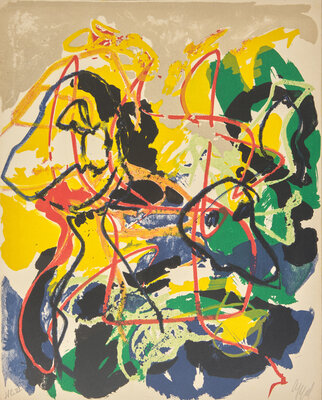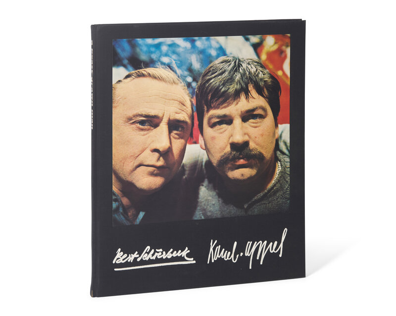 Amsterdam: De Bezige Bij, (ca. 1963). First and limited edition, one of only "a few" hors commerce copies (outside an edition of 75 numbered copies), signed by Karel Appel and Bert Schierbeek. Large folio. Translated from the Dutch by John Vandenbergh. Text printed on white, blue, grey, yellow, black, and red paper. Illustrated with seven color lithographs by Appel (two folding), each signed by him in pencil, and numbered "H.C. VI"; five measuring 19 5/8 x 15 7/8 in. (498 x 403 mm), and two measuring 19 3/4 x 32 1/4 in. (502 x 819 mm); loose as issued. Publisher's full black cloth, stamped in white, large cover photograph by Ed van der Elsken; in original limp plastic slip case, printed in black and in red.