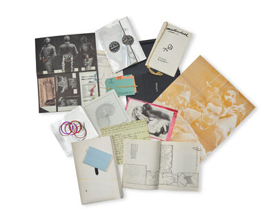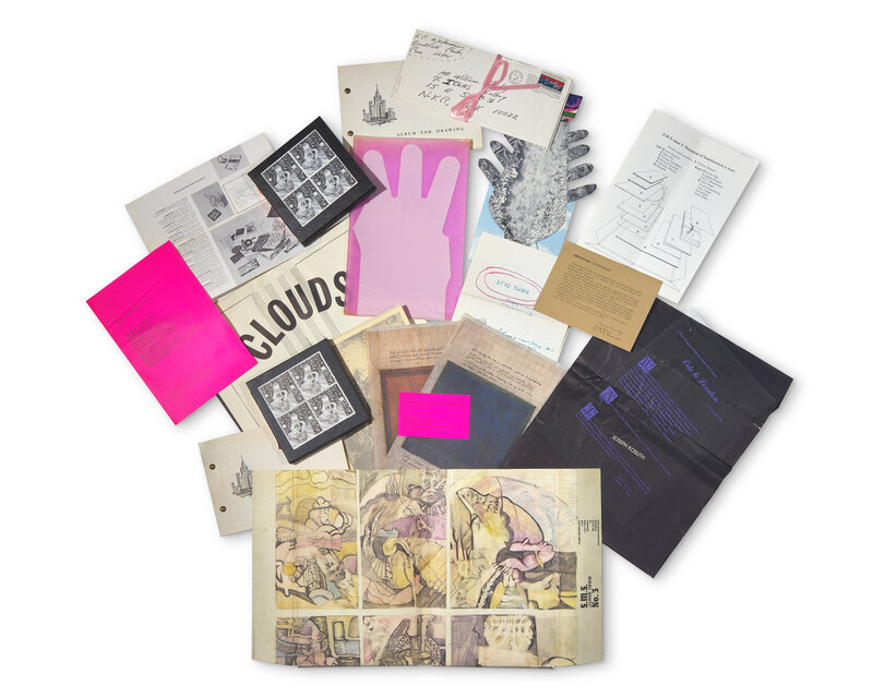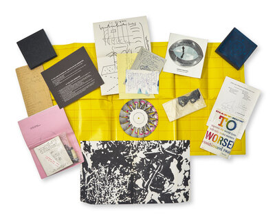 New York: The Letter Edged in Black Press, February-December, 1968. In six volumes. First and limited edition, one of 2,500 unnumbered copies. Near-complete set, comprised of dozens of multiples in various mixed media; lacking the Julian Levy faux pills in No. 1, the Hannah Weiner multiple in No. 3, and the Roy Lichtenstein hat in No. 4. In original artist-designed paper portfolios; each in plexiglass slip case.