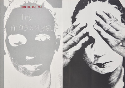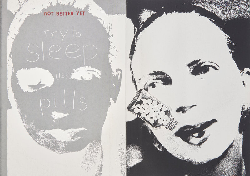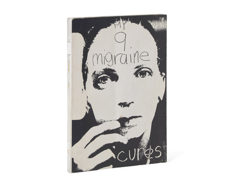 Scarce moveable book by artists Ann Kalmbach (b. 1950) and Tatana Kellner (b. 1950) (KaKe), showing the variety of methods used by Kalmbach to relieve migraines, including wraps, massage techniques, aspirin, "whitefood," "Chinese brain beater," hyperventilation, and sleeping pills.