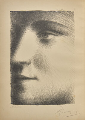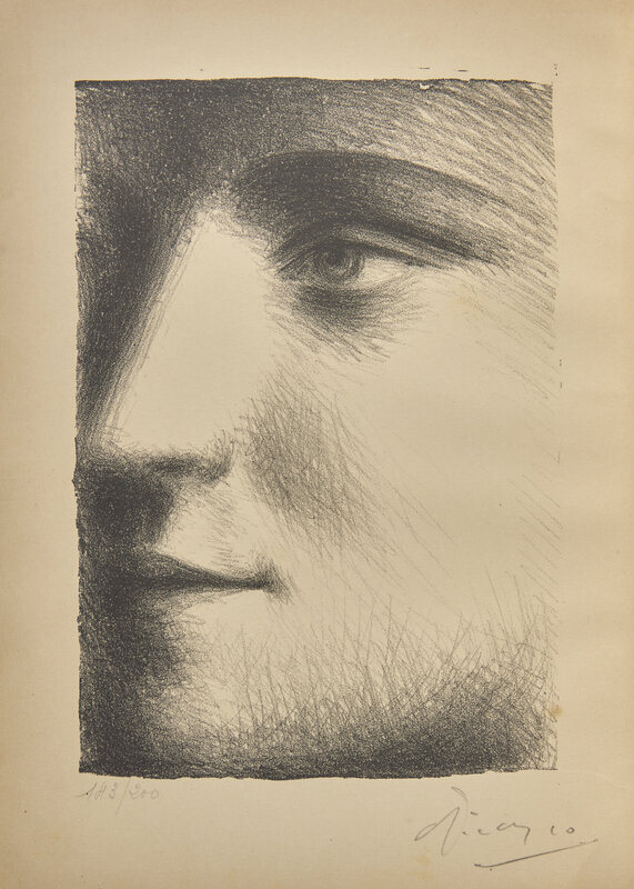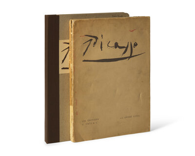 (Paris): Les Editions G. Cres & Cie, (1928). Deluxe first edition. 4to. Illustrated with lithographed frontispiece on Japan paper ("Visage de Marie-Therese"), signed by Picasso bottom right, and numbered 143/200 (from a total of 300), with tissue guard, as well as two color plates and numerous black and white plates and in-text illustrations. Publisher's stiff printed cream wrappers, losses along spine, soiling to wrappers; scattered splitting in gutters; text and plates lightly toned; library label tipped-in at bottom of second tissue guard at front; pencil notations on title-page recto and verso; frontispiece very lightly foxed; in quarter brown cloth chemise. Bloch 95; Cramer 16; Mourlot XXIII