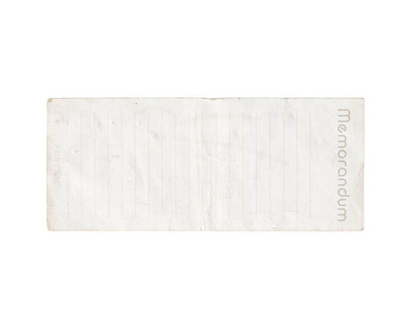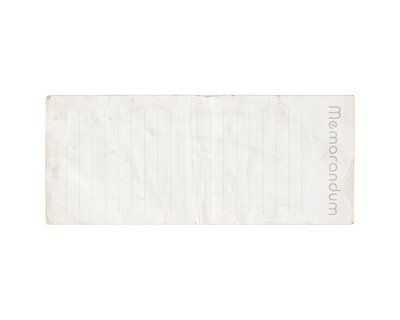No place, ca. 1980. Signed by Andy Warhol on recto. Removed from a novelty PaperBox stationery pad; "Memorandum" printed on verso, with printed ruling. Old creasing; light edge wear. 2 x 4 11/16 in. (51 x 119 mm).