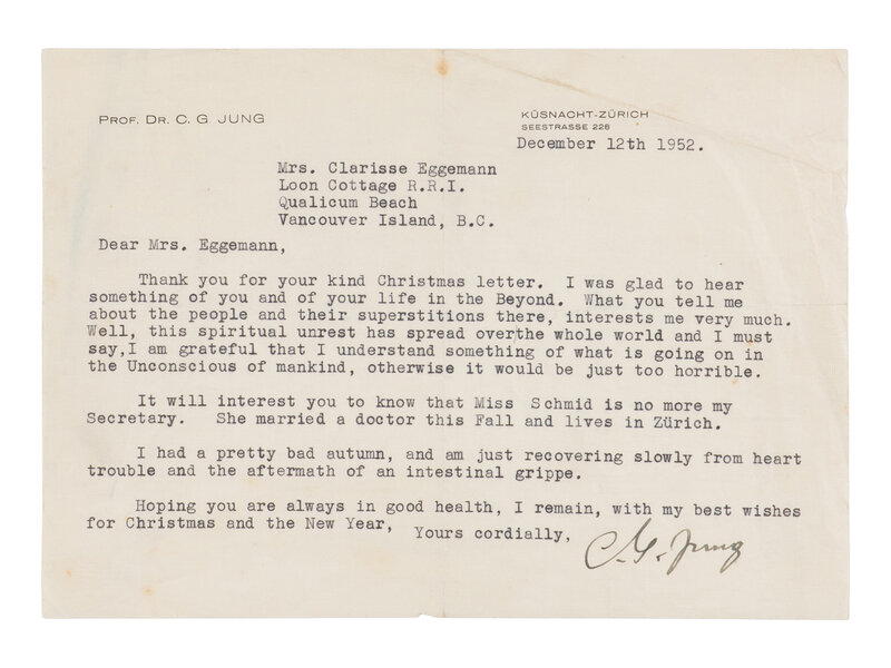 Küsnacht, Zürich, December 12, 1952. Single oblong sheet, 5 3/4 x 8 in. (146 x 206 mm). One-page typed letter, signed by Jung to Clarisse Eggemann, on his personal stationery; with original typed envelope. Creased; a few minor spots or chips.