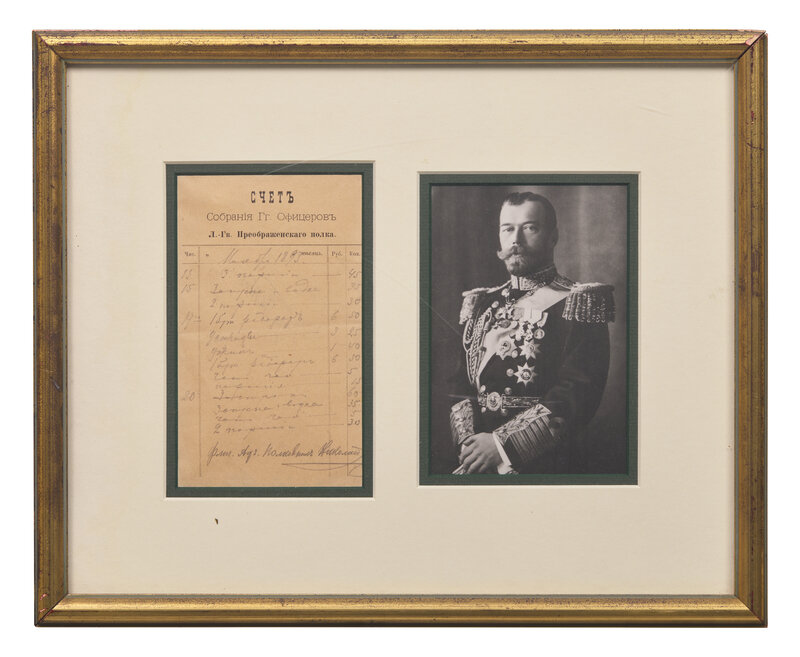 No place, November, 1893. Single sheet, approximately 7 x 4 in. (178 x 102 mm). Partially-printed document, accomplished in manuscript pencil in a secretarial hand, and signed in pencil by Tsarevich Nikolai Alexandrovich Romanov (future Russian Emperor Nicholas II), as Adjutant Colonel, being a bill for the Officer's Club of the Preobrazhensky Life-Guards Regiment. In mat with a portrait of Nicholas II, and unexamined out of frame, 13 x 16 in. (330 x 406 mm).