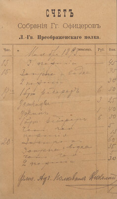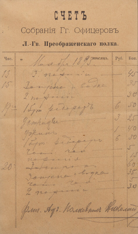 A scarce document, signed by Tsar Nicholas II, a year before his ascension to the throne to become the last Emperor of Russia. Here, Nicholas signs a bill for meals served to the Officer's Club of the Preobrazhensky Life-Guards Regiment over four days in November, 1893 (13th, 15th, 19th, and 20th). The receipt lists various types of fare ordered, including hors d'oeuvres, vodka, beefsteak , oysters, tea, and various meals and portions, alongside their cost.