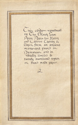 One of the rarest of the Black Sun Press publications, being a facsimile of a Hindu erotic love manual "taken from an ancient manuscript found in Damascus." (from the colophon). "Since the twenty copies of Moon Letter (the original title of the Damascus manuscript by Dehzad Nezaki was Mah-Name) would undoubtedly have run afoul of customs officials in America and England, despite the fact that it was smaller than one's palm, Harry [Crosby] arranged to dispose of them in France, discreetly, and for the substantial sum of a thousand francs..." (Ford, Published in Paris, p. 182).