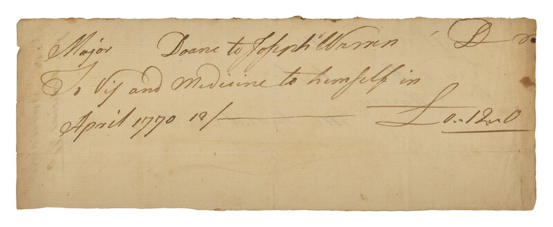 A very rare autograph document by Founding Father and leading early American patriot Joseph Warren (1741-75). Here, Warren pens a medical bill for a Major Doane, presumably Chatham selectman, Justice of the Peace, and Representative to the General Court, Joseph Doane (1721-78).