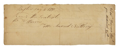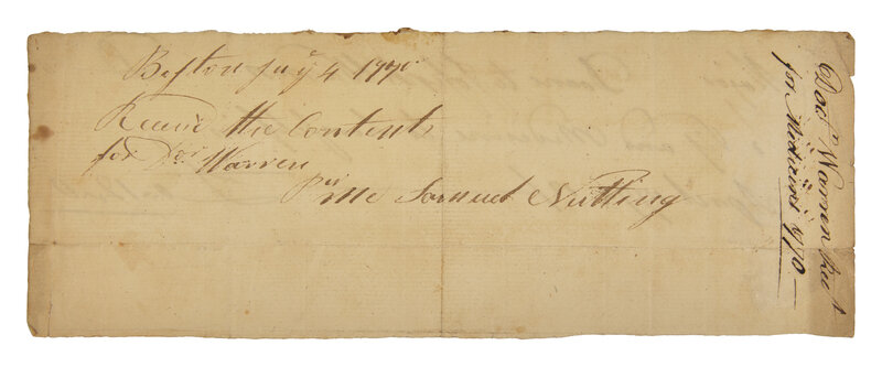 (Boston), April, 1770. Single oblong sheet, 3 1/8 x 8 3/8 in. (79 x 213 mm). Autograph medical bill, signed in the third person by American physician and Founding Father, Joseph Warren: "Major Doane to Joseph Warren, To Viz and Medicine to himself in April 1770 18/--£0.12.0" Docketing and notation on verso: "Boston July 4 1770 / Receiv'd the Contents for Dr. Warren for Mr. Samuel Nutting". Creasing from old folds; light spotting along edges. Lot includes an engraved portrait of Warren.