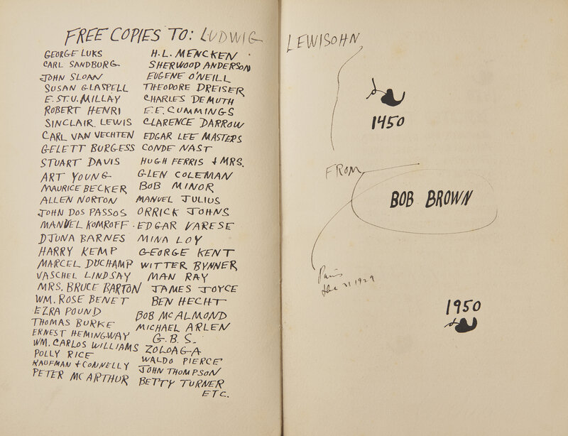 (Paris: The Black Sun Press, 1929). First and limited edition, one of 150 unnumbered copies. Presentation copy, inscribed by Bob Brown on title-page, and opposite on "Free Copies" page, to novelist and critic Ludwig Lewishohn, dated Paris Dec. 31, 1929. 8vo. Publisher's stiff printed wrappers; in original glassine, small loss at foot of spine; illustrated book-plate of Elizabeth Clark; inscribed by Clark on front free endpaper: "Elizabeth Clark Paris June 28, 1934 N.B.- I found this in the book stalls beside the Seine." Minkoff A-25