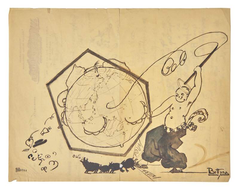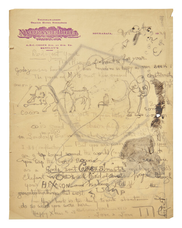 N.V. Oranje Hotel, Surabaya, East Java, Indonesia, November 18, 1929. One sheet, 11 x 8 3/4 in. (279 x 222 mm). One-page autograph and illustrated letter, on "N.V. Oranje Hotel" stationery, signed by Brown ("Me") to "Bobrose & Mrs Brown Red". With a full-page pen and ink drawing on verso.