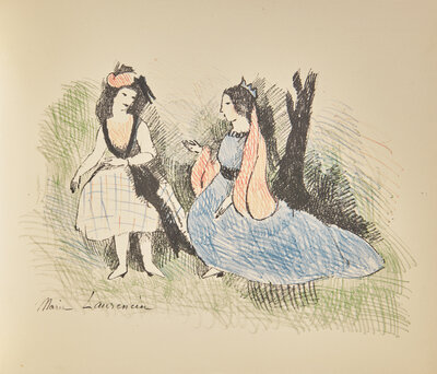 Paris: The Black Sun Press, 1930. First edition, American issue, #185/350 numbered copies on Rives Paper (from a total of 420). Oblong 4to. Title-page and text printed in black and in red. Illustrated with six color lithographs by Marie Laurencin, with tissue guards. Publisher's stiff printed wrappers; in original glassine; slip case wanting. Minkoff A-39