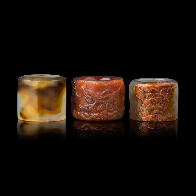 Comprising one carved in high relief with a dragon and a tiger; one carved in low relief with flowers, and a plain thumb ring.