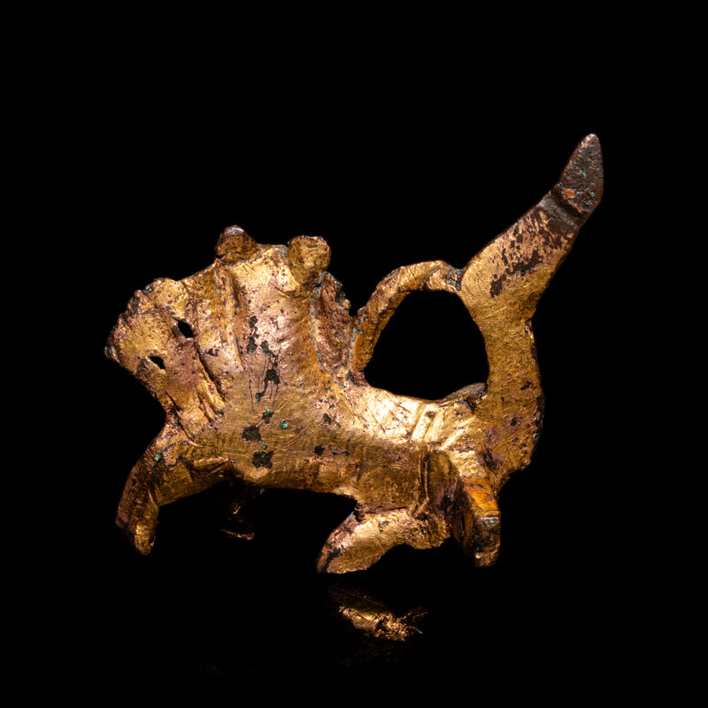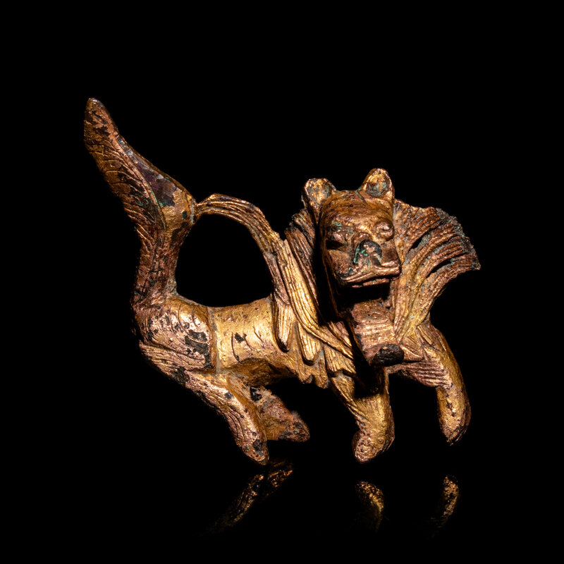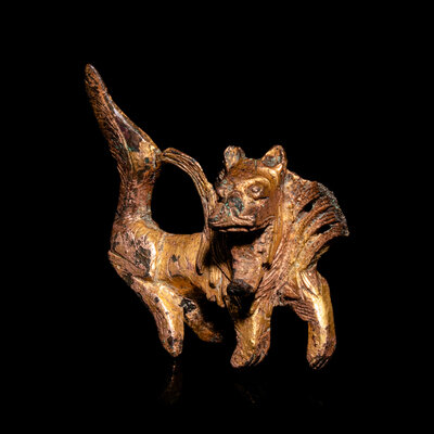 A Small Chinese Gilt Bronze Fu Lion-Form Decoration, Jin-Northern and Southern Dynasties