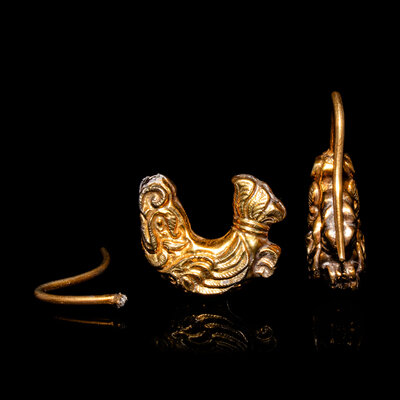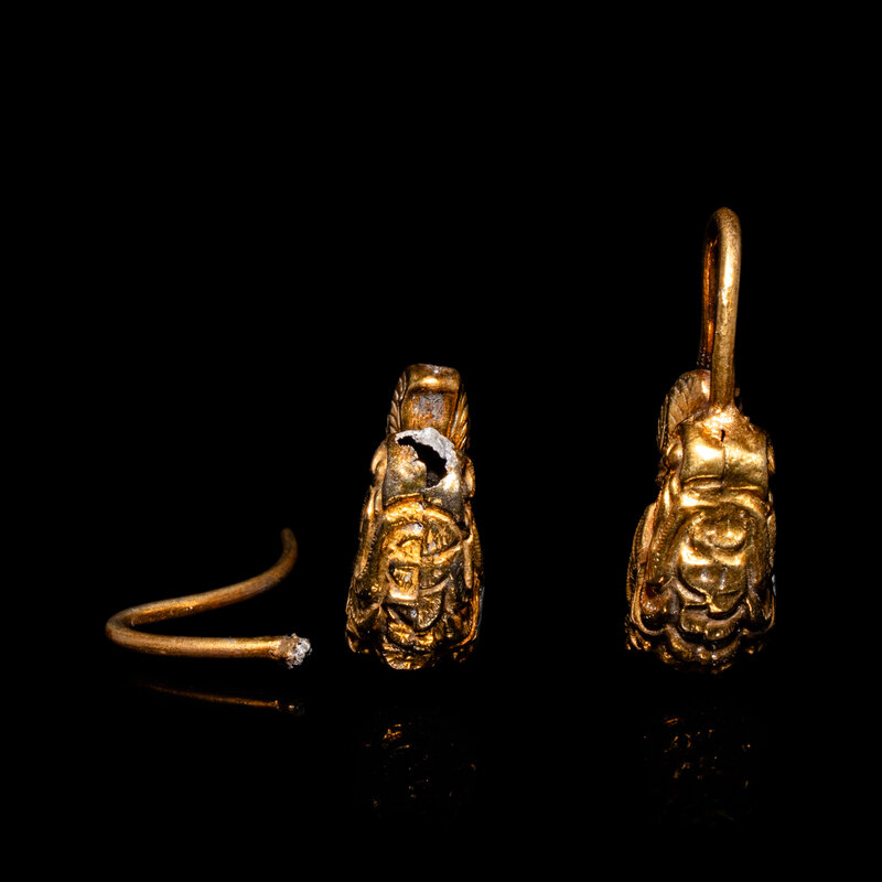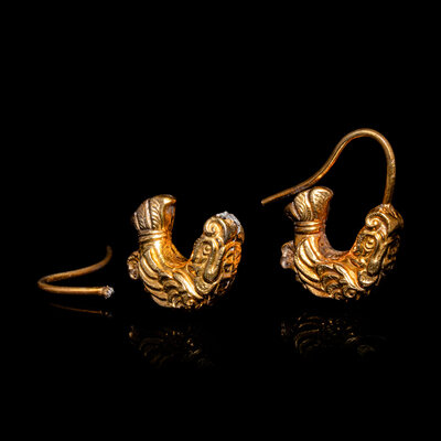A Pair of Chinese Gold 'Capricorn' Earrings, Erhuan, Liao Dynasty