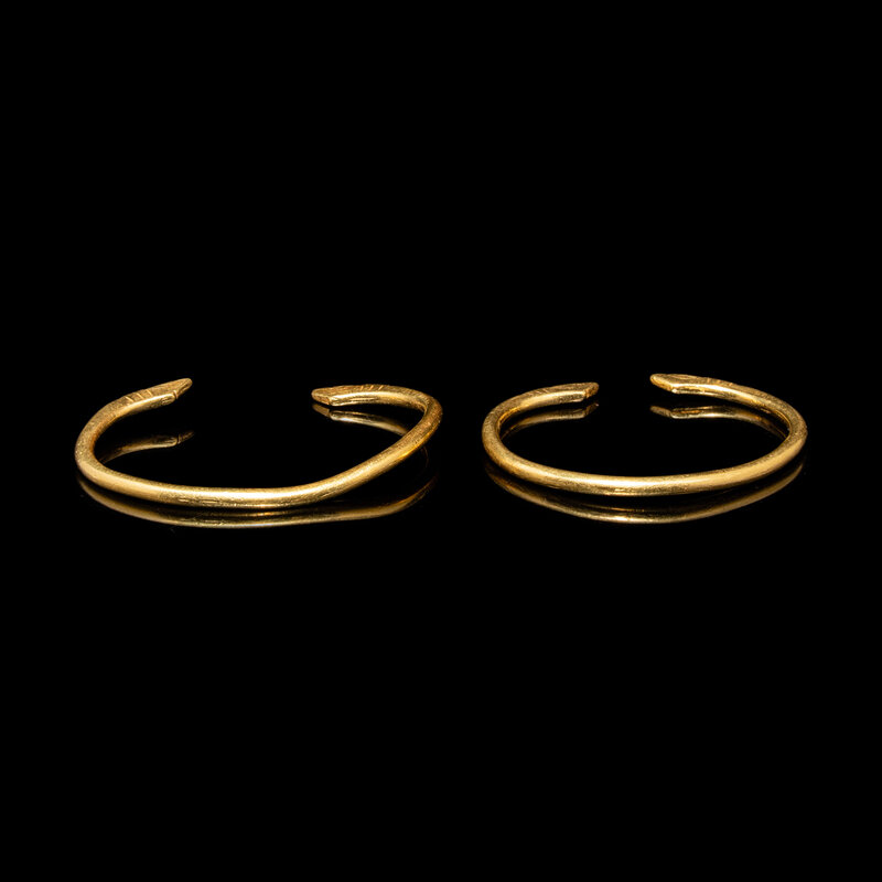 Each penannular-form bracelet with a solid, rounded shank flattening towards its terminals, with worn hammered details to present a pair of facing dragons.