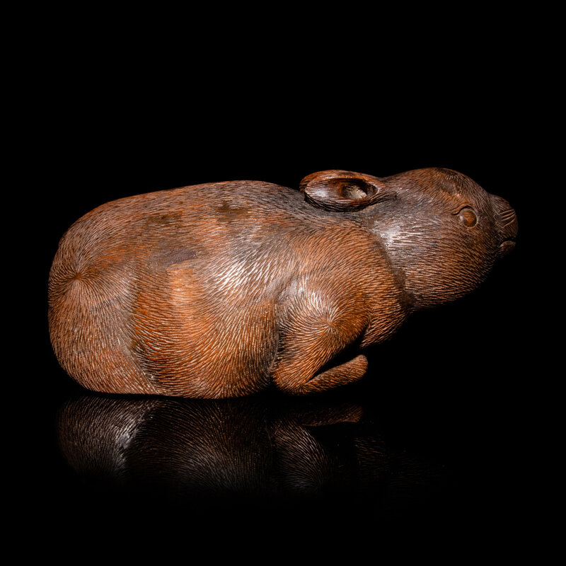Carved in the round, the rabbit depicted in a recumbent posture.