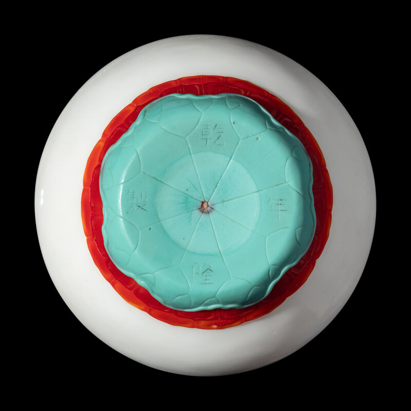 Formed from a solid block of opaque milky white glass overlaid with a layer of turquoise glass to the mouth and a layer of ruby red glass carved through to the wide shoulders decorated with taotie masks, the walls tapering to two rows of ruby red lotus petals skirting the foot, the base in the form of a large turquoise lots leave incised with a four-character Qianlong mark and of the period.