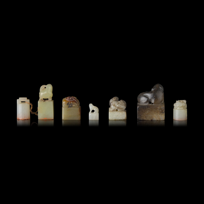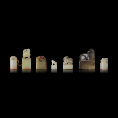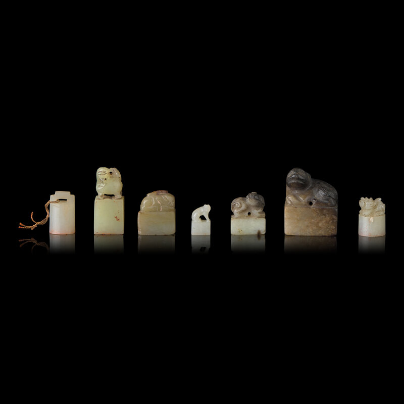 Comprising five square examples carved with mythical beasts finials, the first a russet and yellowish celadon stone, the second a black and yellowish stone, the third a pale celadon stone and the fourth a small white jade stone, the fifth a black and pale celadon stone; two cylindrical white jade examples, the first with the finial carved in the shape of a crouching dragon, the second with a humpback finial.