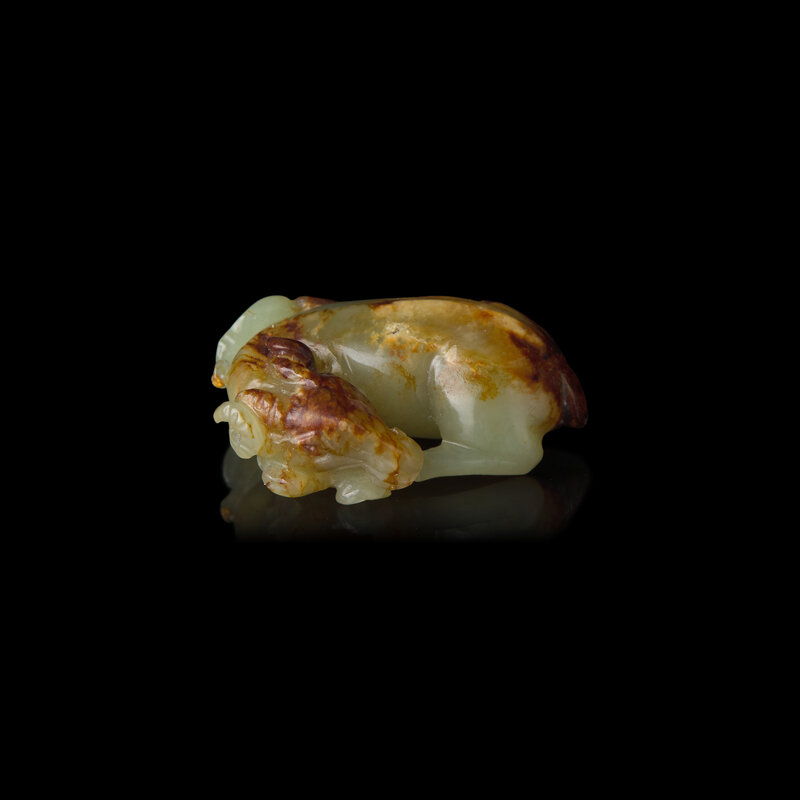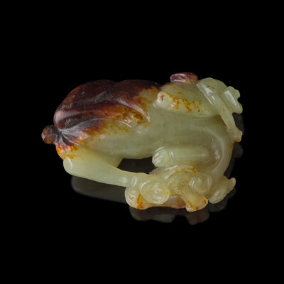 This adorable goat is rendered in a recumbent posture, his head resting gently upon a small lingzhi mushroom. Exquisitely carved from celadon jade with subtle beige inclusions.