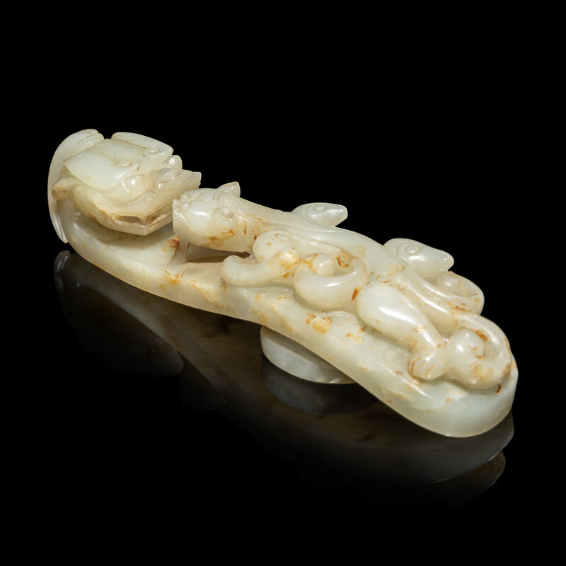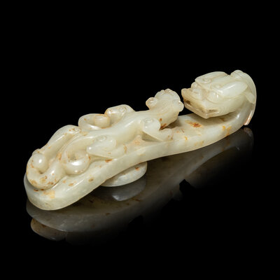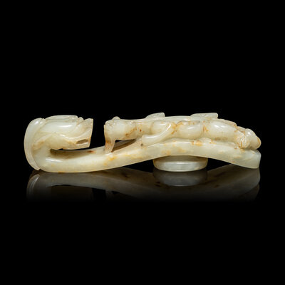 A Chinese Pale Celadon and Russet Jade 'Dragon' Belt Hook, Qing Dynasty
