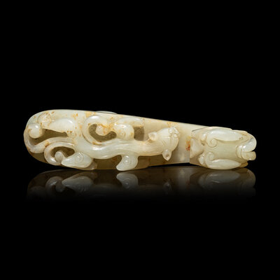 The large belt hook of an even pale celadon stone with russet speckles, the wide shaft carved in relief depicting a chilong climbing towards the large dragon-head terminal, a circular knob on the reverse.